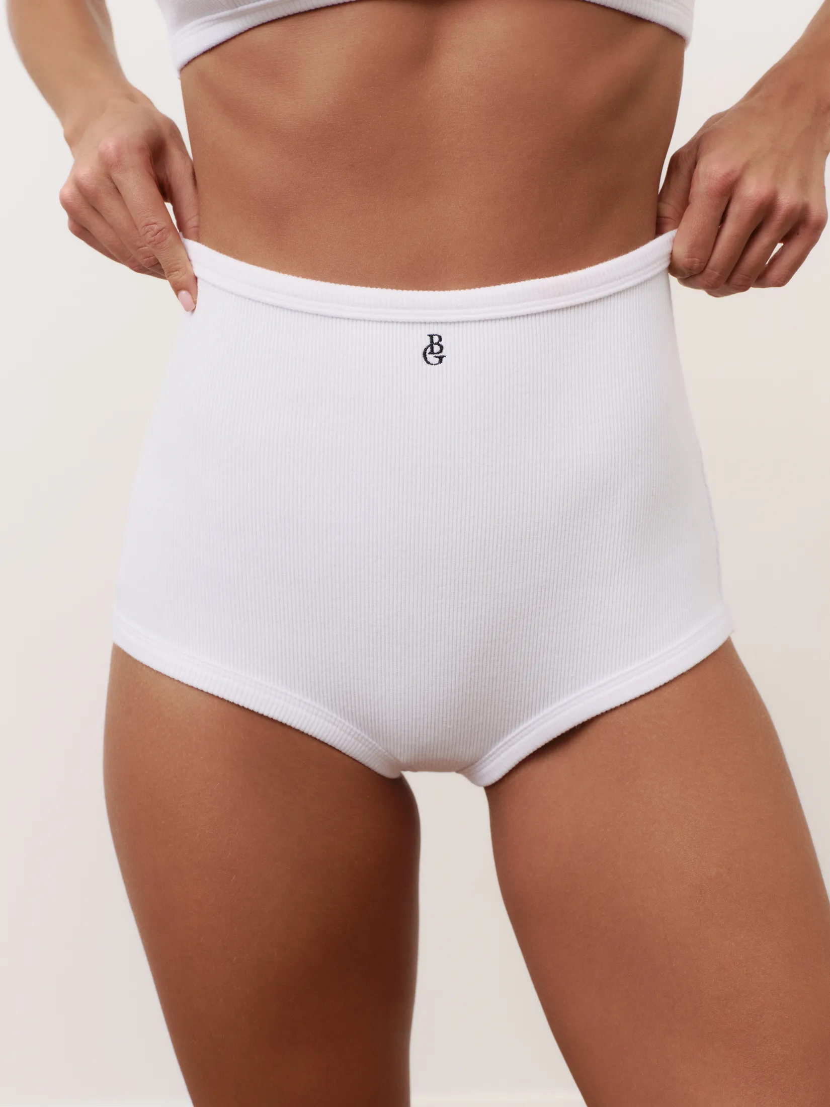 Труси ретро сліпи в рубчик високої посадки, на резинці по талії, окантовані, закриті позаду. Виконані з тонкої та еластичної бавовни. Вишитий логотип BG по центру спереду. Технологія обробки швів дозволяє виробу залишатись максимально комфортним, забезпечуючи легке облягання по фігурі.